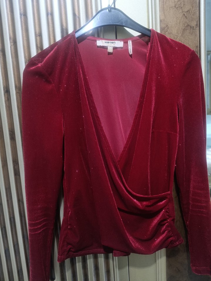 Bordo parlak renkte, drapeli V yakalı ve uzun kollu, vücuda oturan kadın bluz. Cesur ve gösterişli bir parti stili için uygundur. ✨