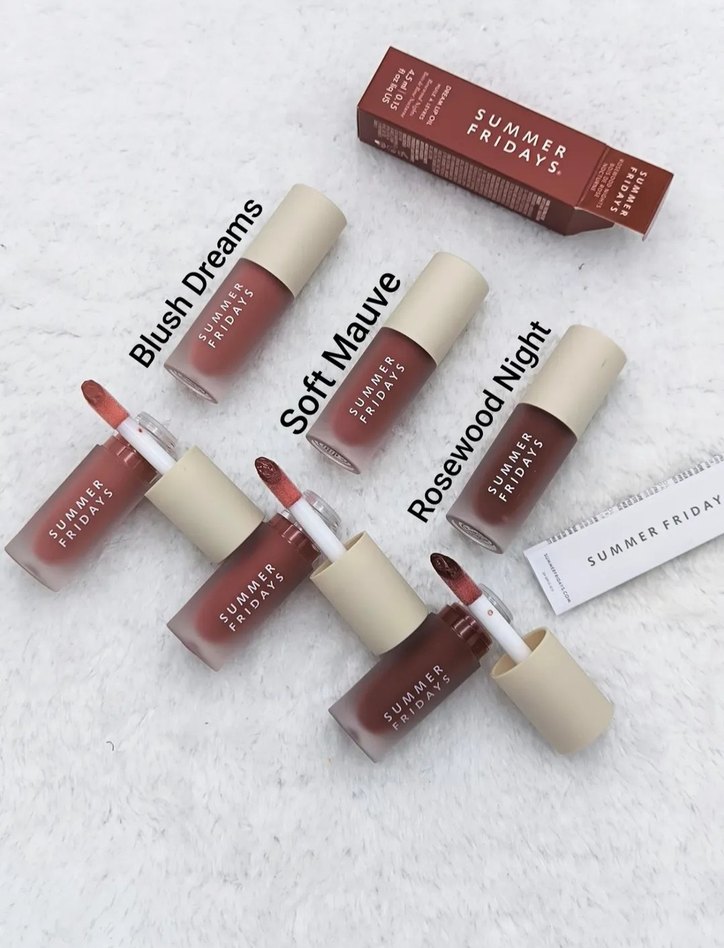 Summer Fridays'in pastel bordo tonunda dudak parlatıcısı, pürüzsüz ve parlak bir görünüm sunar. Ambalajda SUMMERFRI yazısı bulunur.