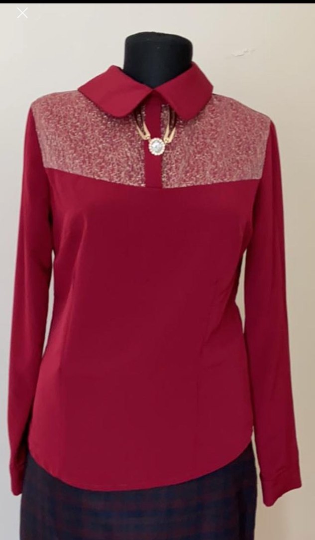 Şık , yepyeni. Bordo parlak renkte, düğmeli ve yakalı uzun kollu kadın gömleği. İpek gibi kumaştan, ofis için uygun, klasik ve çağdaş tarzda.