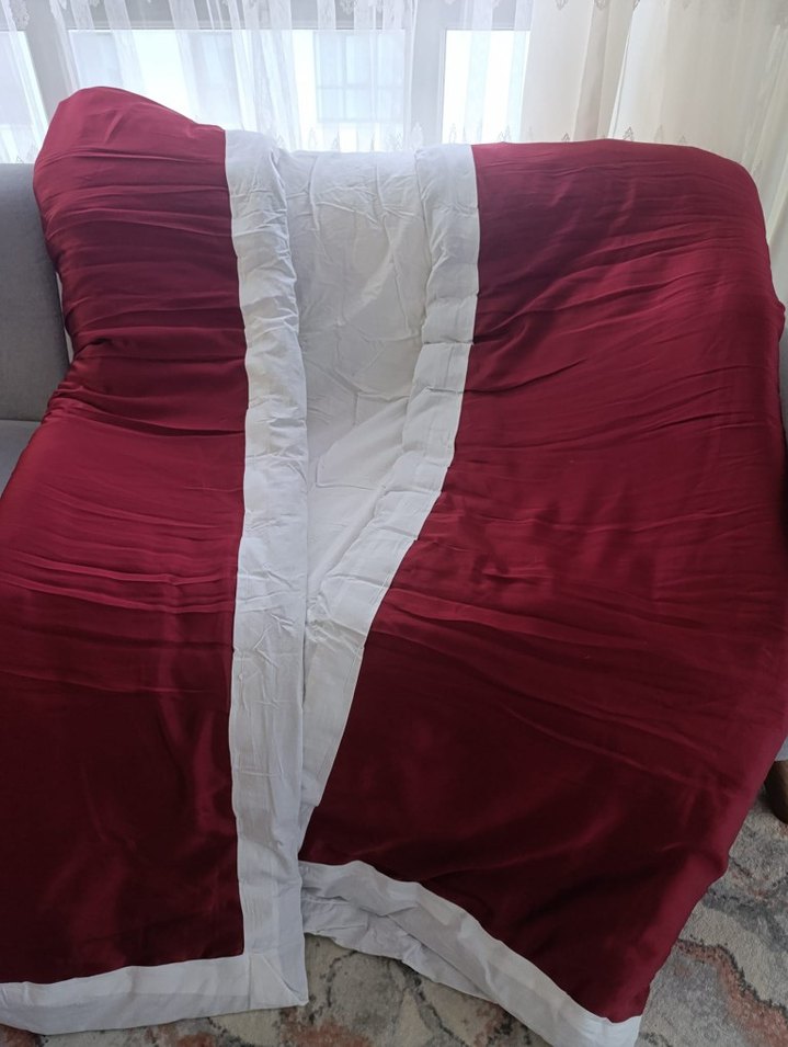 Bordo renkli, parlak ve düz desenli yün yorgan yatak odasına şık bir dokunuş katıyor. ️
