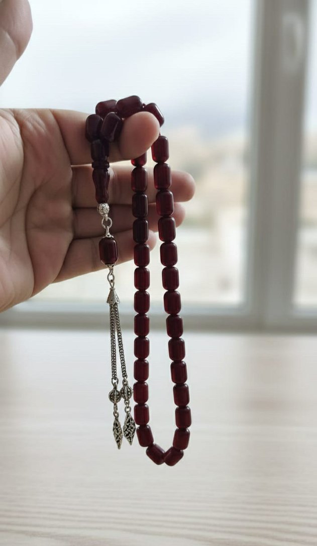 Bayrak kırmızısı renginde, sade tasarıma sahip erkek tesbih. Düzgün cilalı boncuklar ve zarif püskül detayı bulunur.