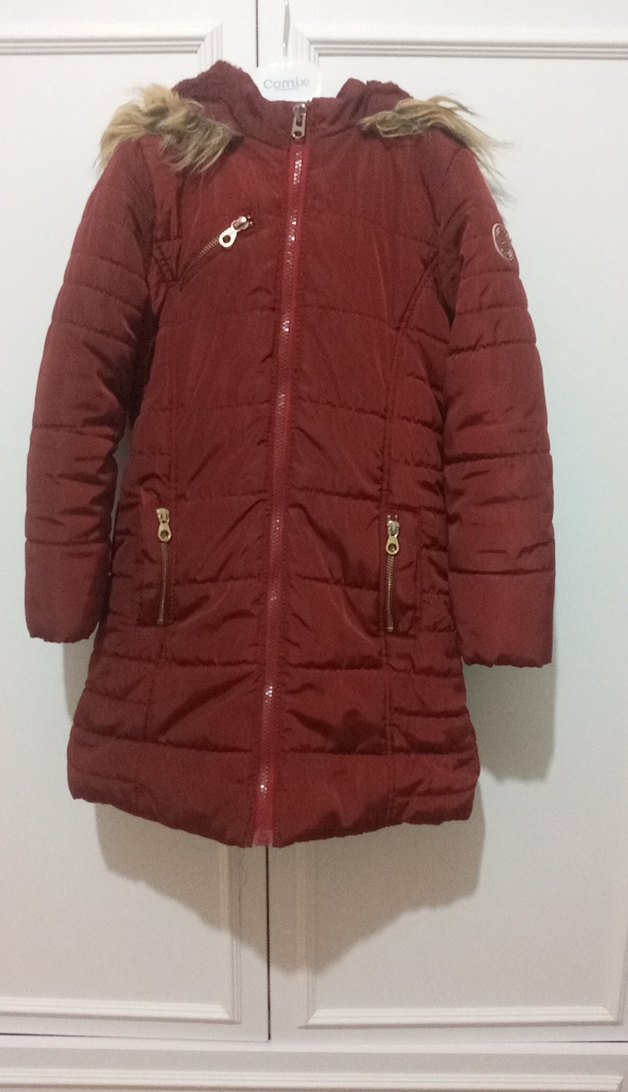 Parlak bordo renkli, fermuarlı cepli, kesimli kız montu. Suni kumaştan yapılmış, notched lapel yakalı, sokak modasına uygun.
