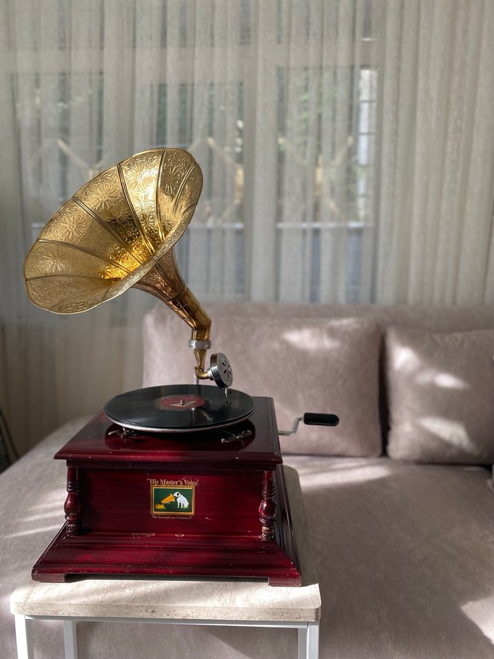 Dekoratif altın renkli hoparlör ve vintage tasarımlı bordo parlak gramofon müzik sistemi.
