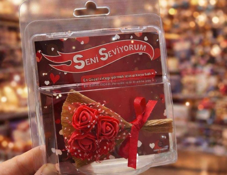 Bordo parlak güllerden oluşan küçük bir buket, kırmızı kurdele ile bağlanmış. "Seni Seviyorum" mesajı ve "En güzel çiçeği görmek için arkaya bak" yazısı bulunuyor.