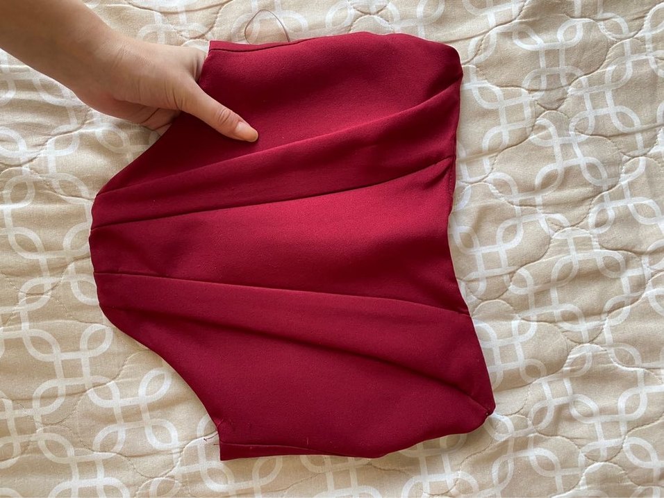 Bordo renkli, parlak yüzeye sahip, normal boy midi uzunluğunda, vücuda oturan hemşire korsesi.