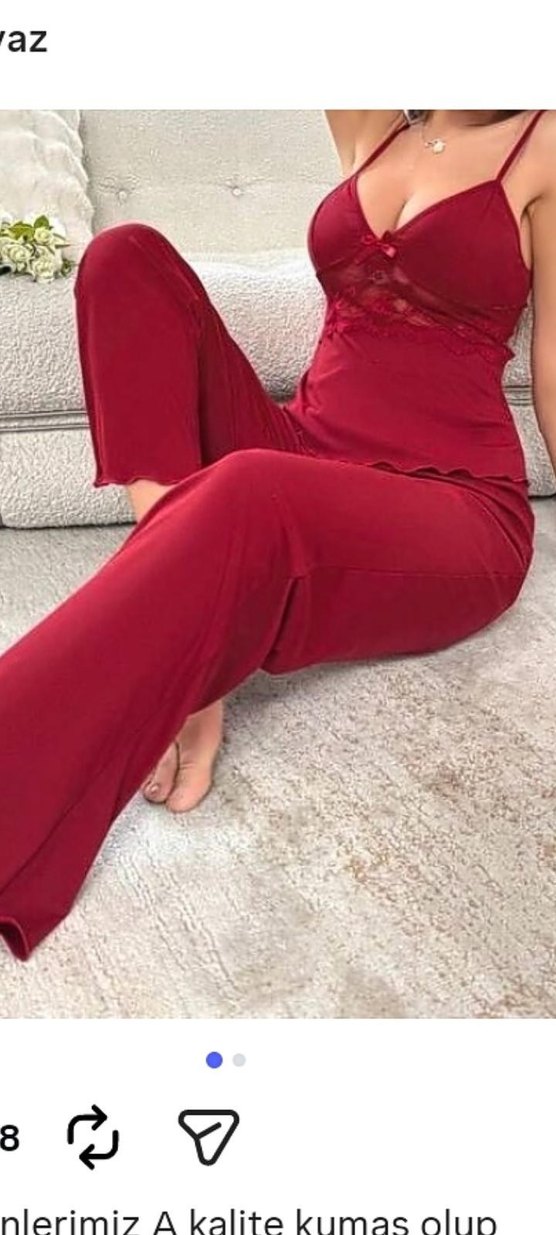Bordo parlak renkte, ince askılı, uzun paçalı ve vücuda oturan modern tarzda kadın pijama takımı.