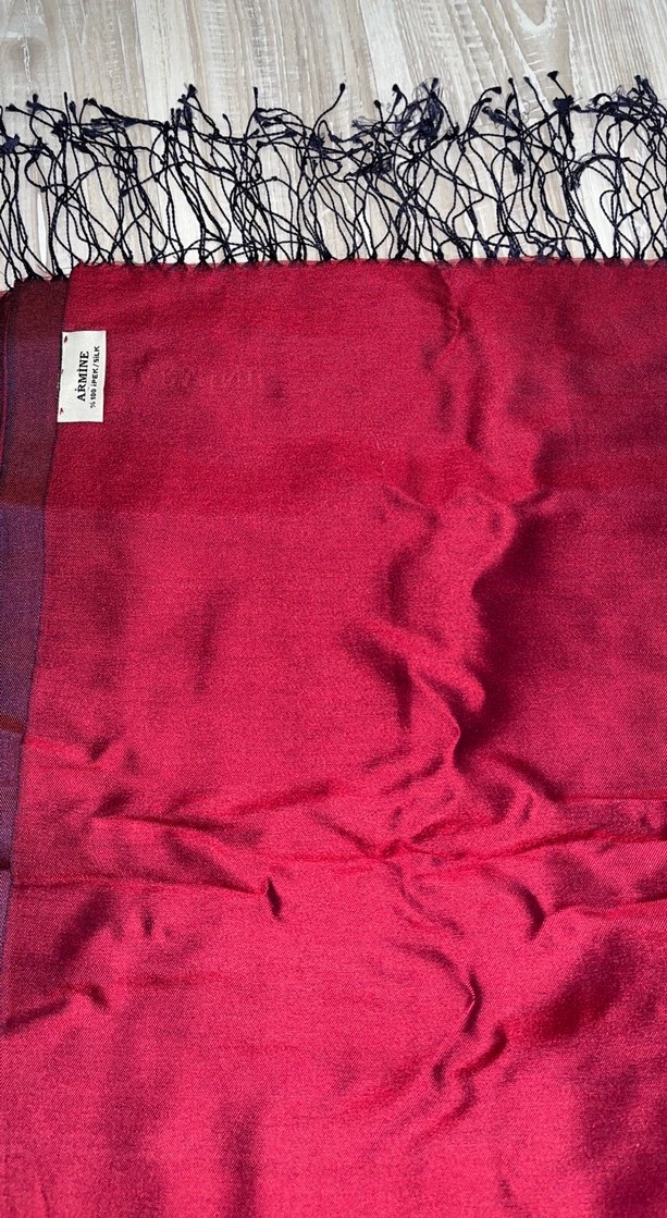 Bordo parlak renkte, ipek ve drapeli kadın şalı. Bohem, retro ve hippie tarzına uygun bir aksesuar. Bordo lacivert 2 renkli ipek armine şal