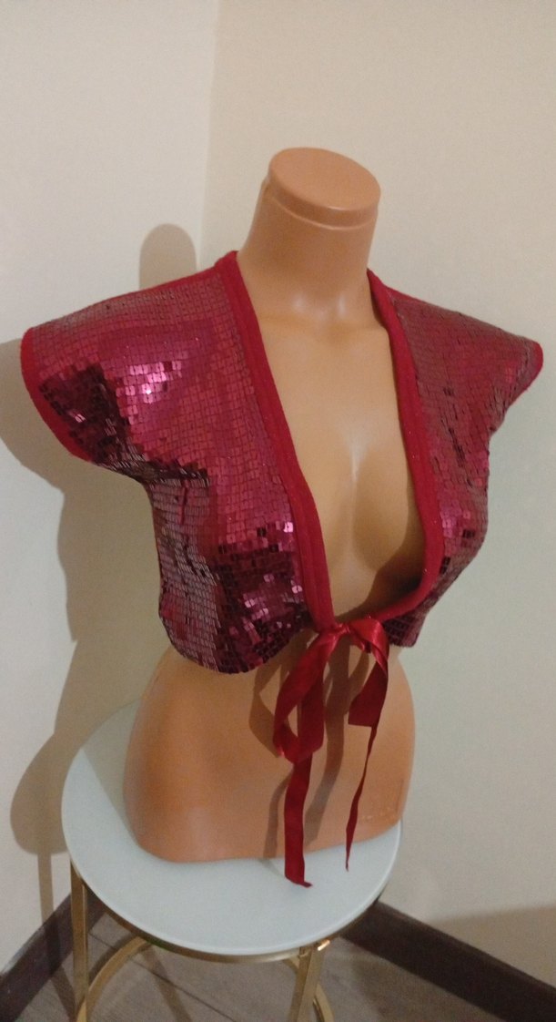 Bordo parlak işlemeli, straplez yakalı, kolsuz, sentetik kumaştan oturan kesim bolerosu. Drapeli detaylara sahiptir. ✨