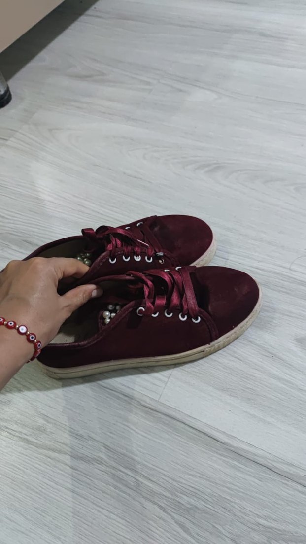 Bordo parlak görünüme sahip, cırt cırt detaylı ve rahat kauçuk tabanlı kadın spor ayakkabısı. Günlük sokak stili için uygundur.