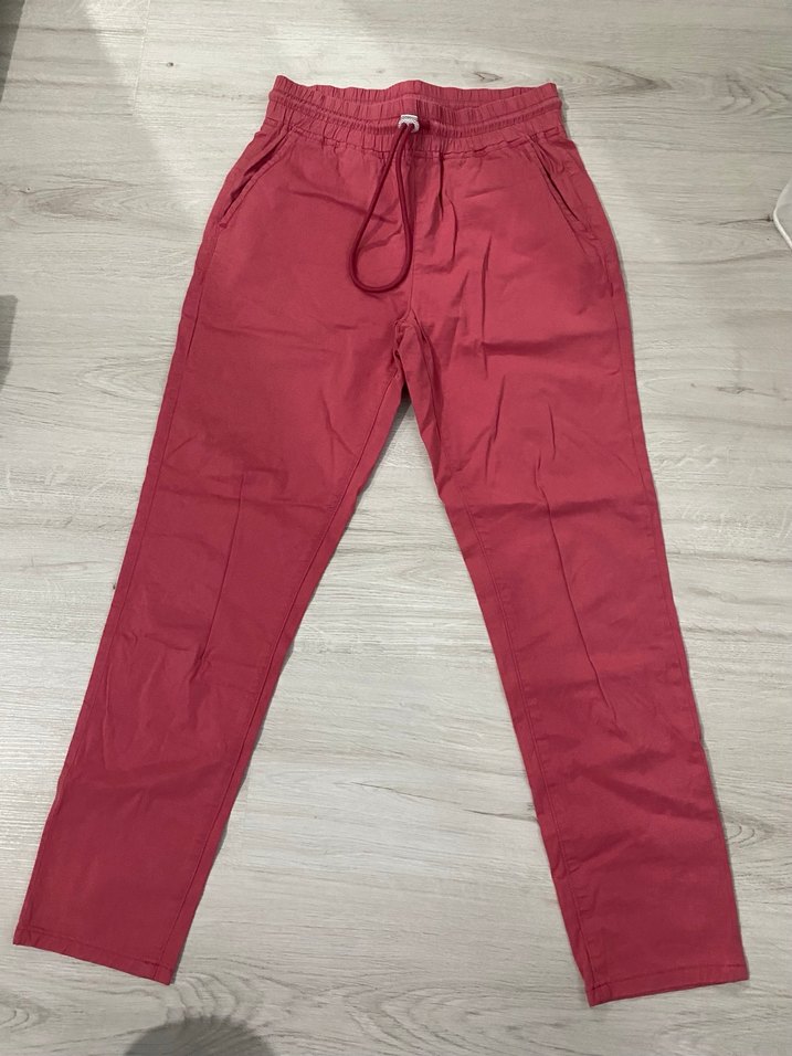 Bordo renkli, parlak kumaştan yapılmış, bol kesim ve midi boy kadın pantolon. Lastikli beli ve yan cepleriyle rahat ve şık, günlük kullanıma uygun.