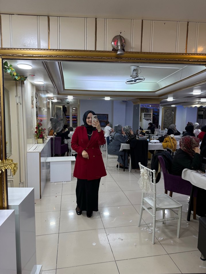 Bu mütevazı kadın takımı, parlak bordo pamuk ceket, etnik desen ve kesik yaka içerir. Uzun kollu, normal kesim ve midi boydadır, düğün ve iş ortamları için uygundur.