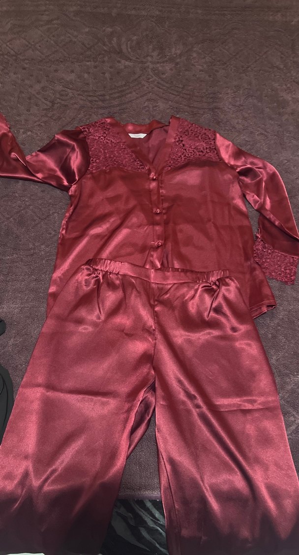 Hiç giyilmedi.Uzun kollu, bol kesim, parlak bordo saten kumaştan kadın pijama takımı. Düğmeli üst kısmında dantel detayları ve midi boy pantolon bulunur. Rahat ve sade tarzda.