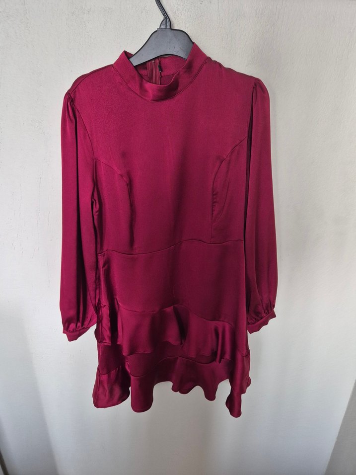 Bordo parlak saten kumaştan, yüksek yakalı, uzun kollu, bol kesim ve fırfır detaylı midi uzunlukta kadın tunik. Street wear tarzına uygun. ✨ Bir kere giyildi hiçbir kusuru yoktur..