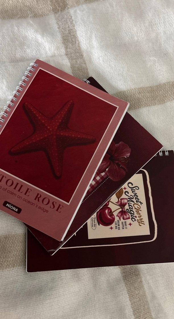 Parlak bordo kapaklı, yıldız denizyıldızı desenli spiralli defter. tanesi