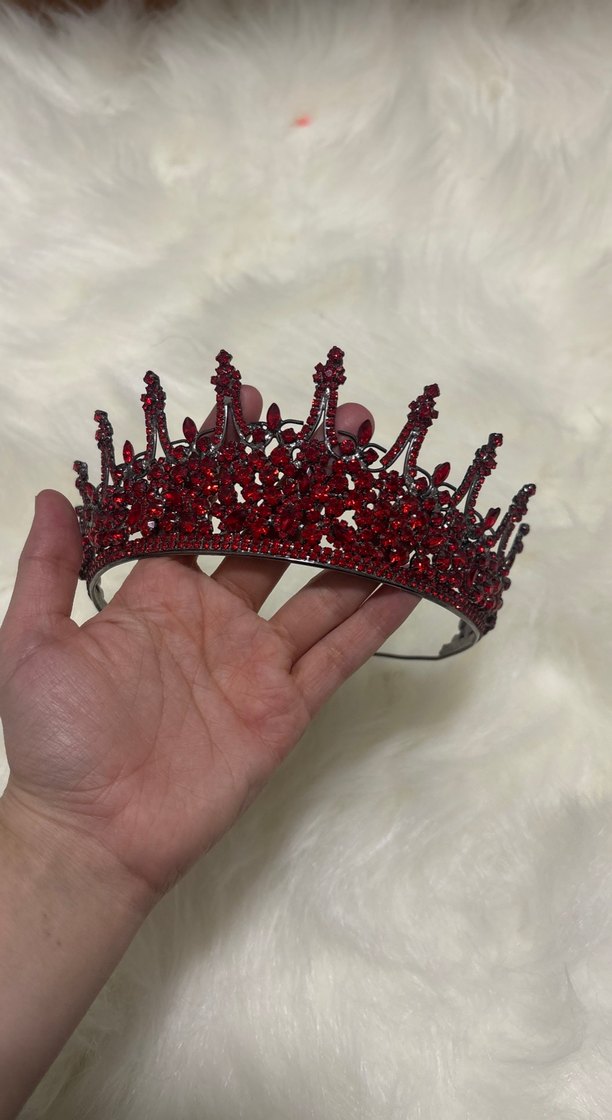 Bu koyu bordo saç aksesuarı, parlak kristal detaylarla gotik tarzda tasarlanmış eski moda bir taçtır.