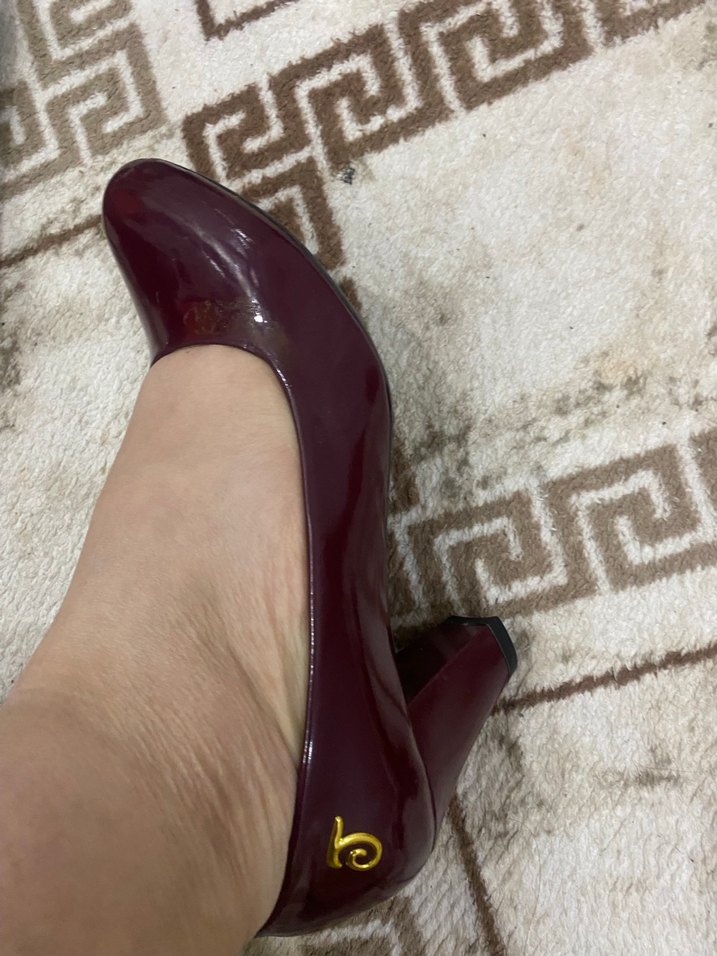 Bordo parlak, kauçuk malzemeden blok topuklu kadın stilettoları, kürk detaylı ve baskılı desene sahip. Klasik ve cesur tarzda, günlük kullanım için uygun.