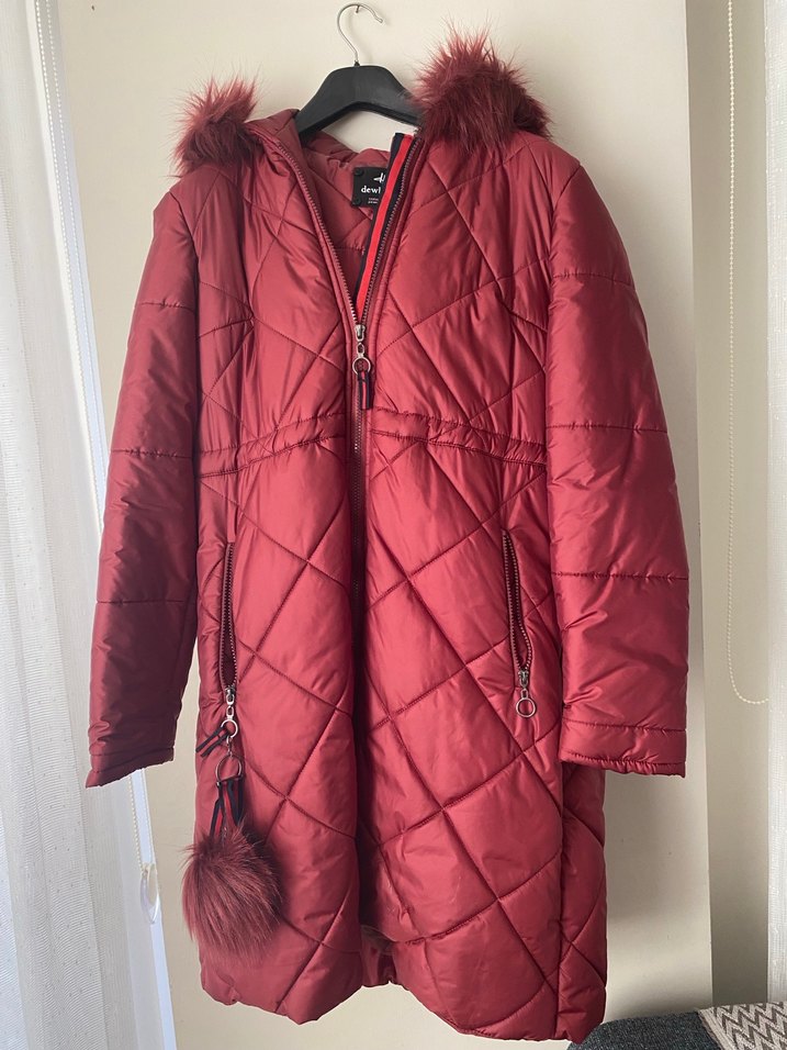 Bordo parlak sentetik kumaştan, kapüşonunda kürk detaylı, normal midi boy, fit kesim kadın kışlık mont. Rahat ve günlük kullanıma uygun. ❄️