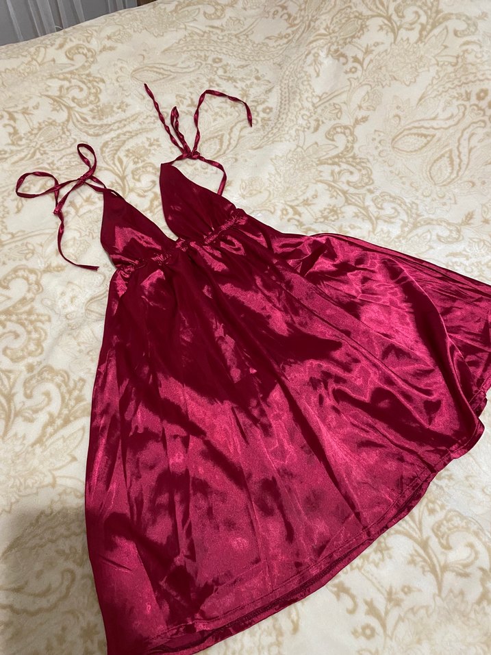 Bordo parlak kumaştan, v yakalı ve askılı, drapeli midi uzunlukta, vücuda oturan elbise. Romantik gece için ideal.