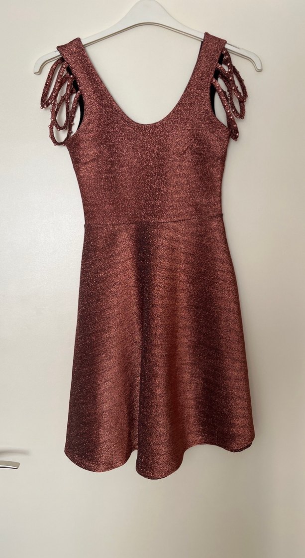 Parlak bordo kumaştan, V yaka ve askılı, drapeli kollu, bele oturan midi uzunlukta elbisedir. Parti için uygundur. ✨