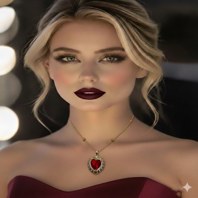Parlak bordo renkli, etnik desenli kalp şeklinde mini kısa gerdanlık, romantik akşamlar için uygun.
