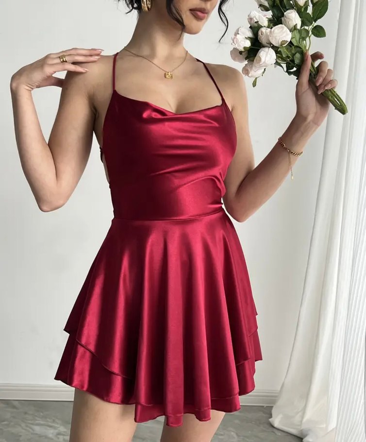 Bordo parlak mini elbise, ince askılı ve straplez yakalı, drapeli detaylara sahip. Bohem tarzda, romantik akşamlar için ideal. hiç giyilmedi