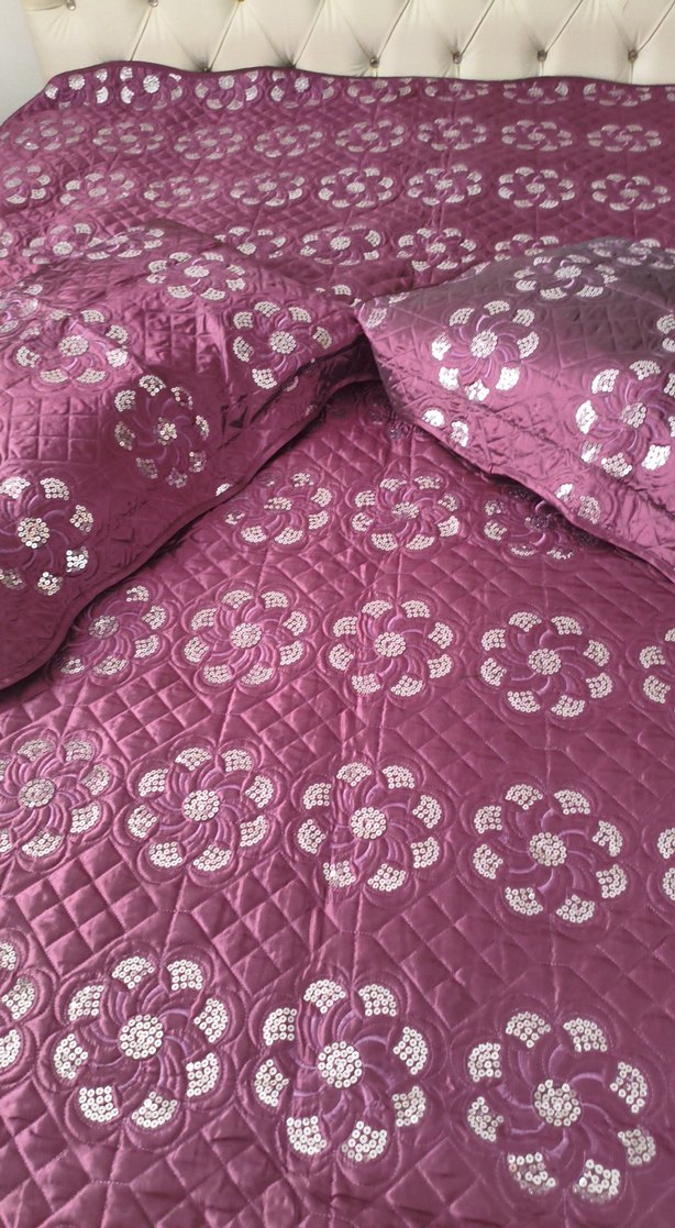 Bordo renk, parlak kumaş üzerine işlenmiş çiçek desenleri ile yatak örtüsüne doku ve şıklık katıyor. boyutu battal boy bazayi aşağıya kadar örten sorunsuz örtü..