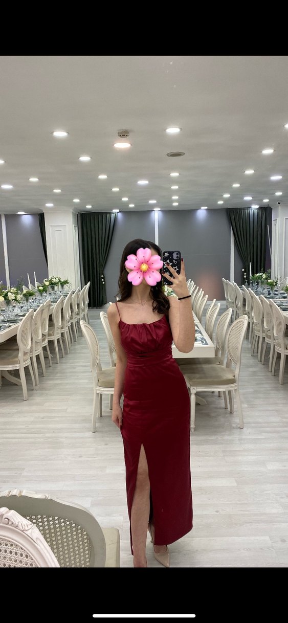 Bordo parlak Saten elbise, ince askılı ve yırtmaçlı bir elbisedir. Bir sefer giydim temiz bir üründür. Bedeni s bedendir 164 boy 50 kilo ile bende fotoğrafta görüldüğü gibi durmaktadır.