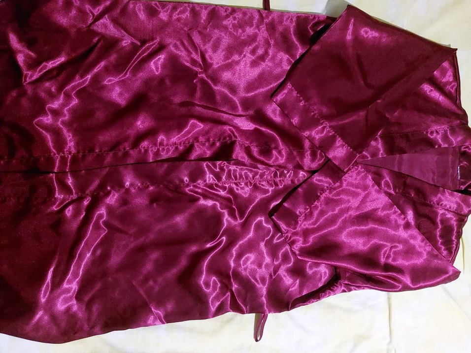 Parlak saten kumaştan, bordo renkli, askılı kollu ve midi boyda, kadın sabahlık