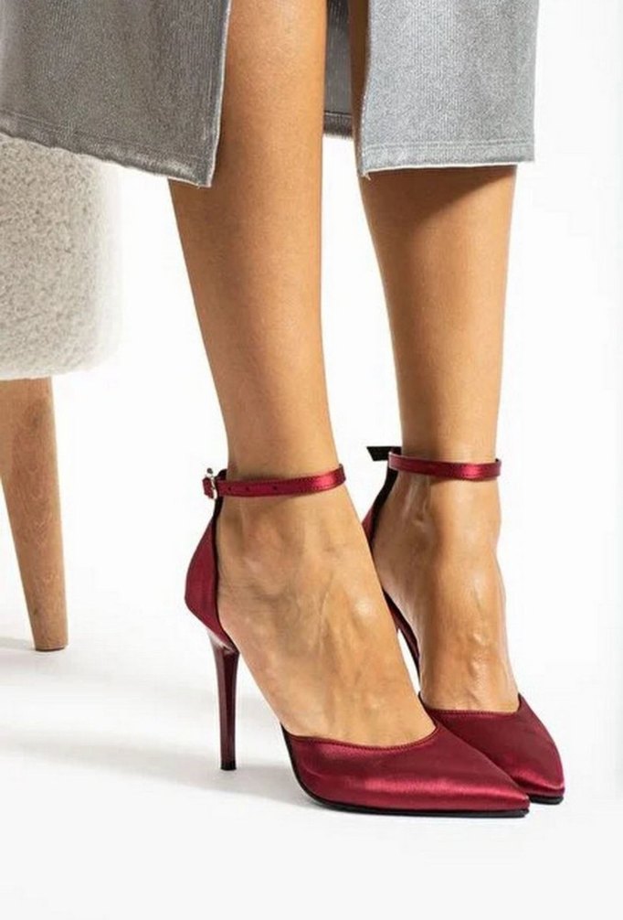 Bordo renkli, parlak ve ipeksi dokulu stiletto topuklu ayakkabılar, bilekte kemerli detayıyla cesur ve göz alıcı bir şıklık sunar.