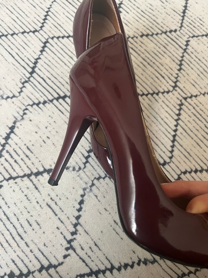 Bordo parlak stiletto topuklu ayakkabılar, yılan deseni ve tokalı detaylara sahiptir. Kauçuk malzemeden üretilmiş, ofis için çağdaş tarzda uygun.