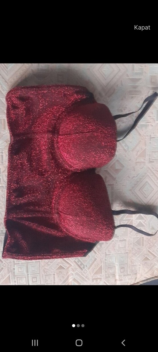 Bordo, parlak sentetik kumaştan, straplez yaka ve düğmeli detaylı, sıkı kesim mini bustiyer. ✨ 85 beden kutusunda sıfır üründür