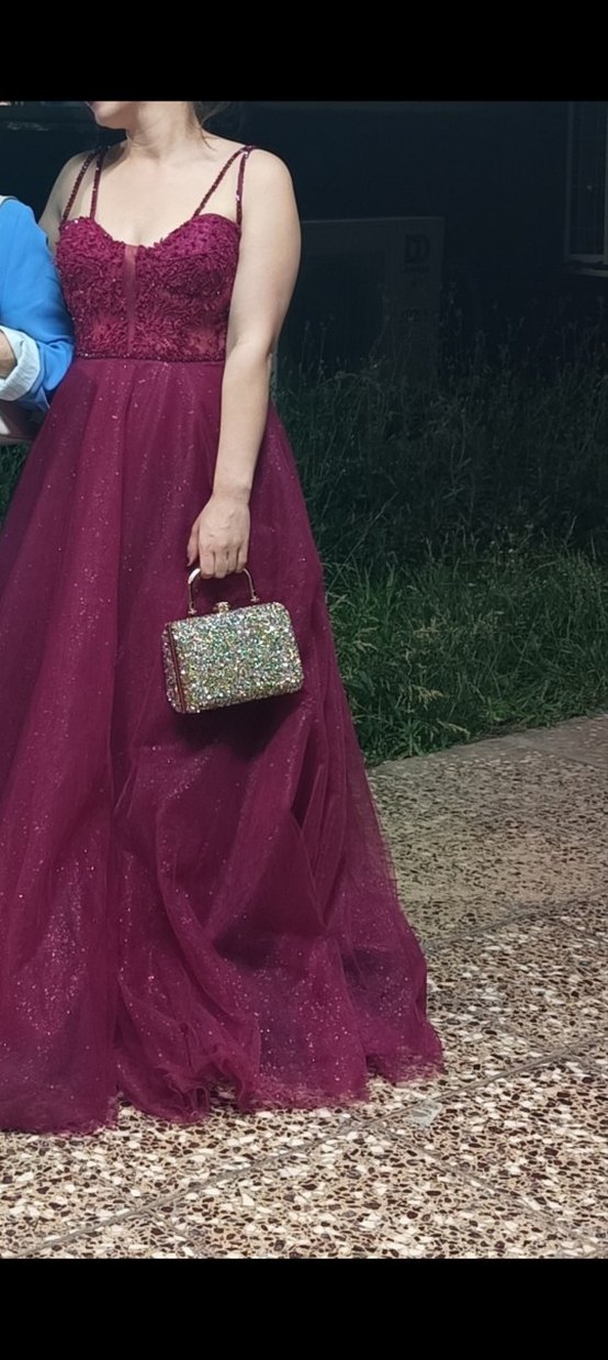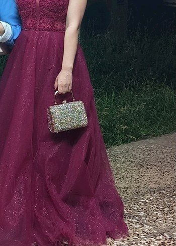 Bordo, parlak desenli kumaştan, straplez ve askılı kollu, vücuda oturan uzun abiye elbisedir. Dekolte bölgesindeki artarda sorun vardı fakat astardan ek parça alınarak tadilat yapıldı. ✨