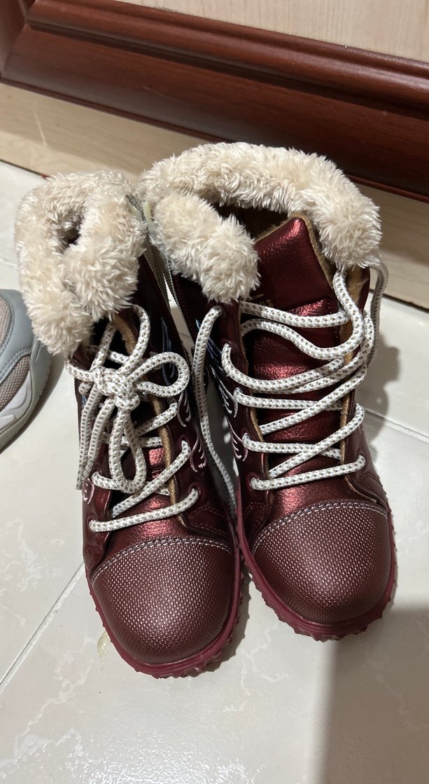 Bordo parlak süet malzemeden yapılmış, kürk detaylı ve bağcıklı kız botu. Sokak modasına uygun, trend görünümler için ideal. ❄️
