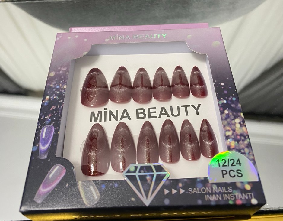 Mina Beauty'den parlak yüzeyli koyu bordo takma tırnak seti. Farklı boyutlarda tırnaklar içerir, mükemmel uyum sağlar. Not ayrı ayrı 160
