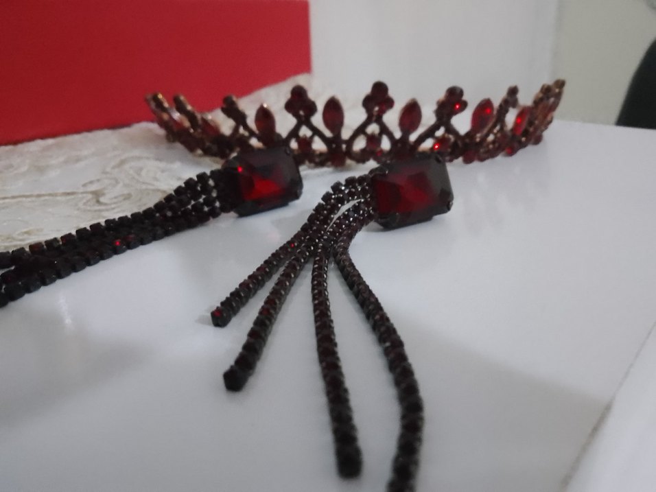 Bordo renkli, parlak taşlarla süslenmiş örme gotik saç aksesuarı, şık ve karanlık bir hava katıyor kinamda bir defa kullanıldı hiçbir sorunu yok sadece kupelerin arka tutturulan kısımları kayıp