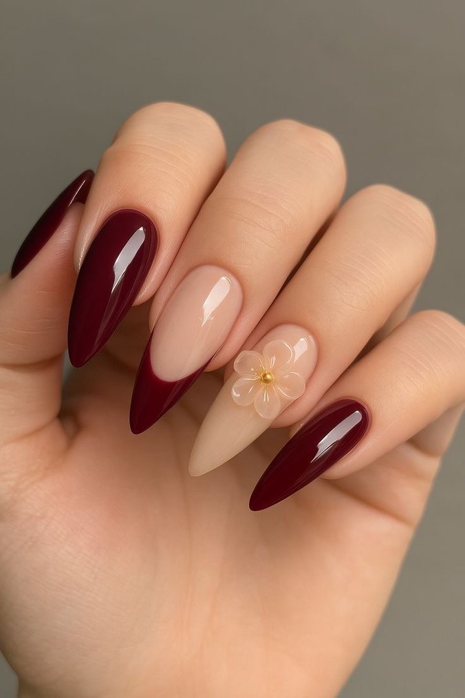 Nude taban üzerinde çiçek 3D tasarımlı, parlak bordo tırnak süslemeleriyle şık bir görünüm sağlar.