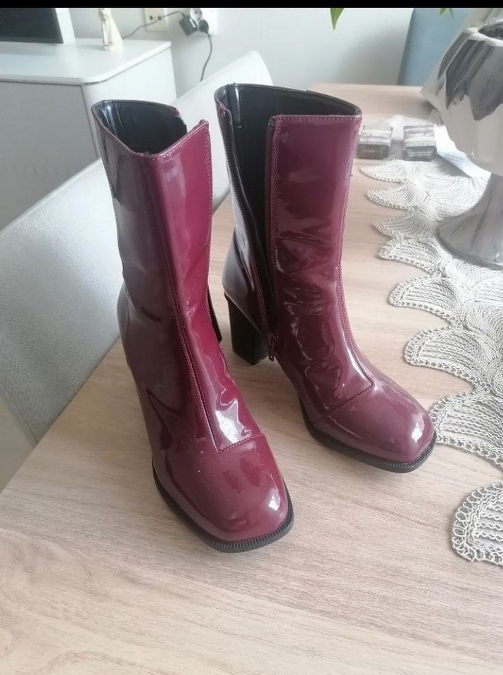 Bordo parlak tokalı blok topuklu kadın bot, kauçuk malzemeden üretilmiştir. Desensiz tasarımıyla günlük kullanıma uygundur. Bir kere giydim