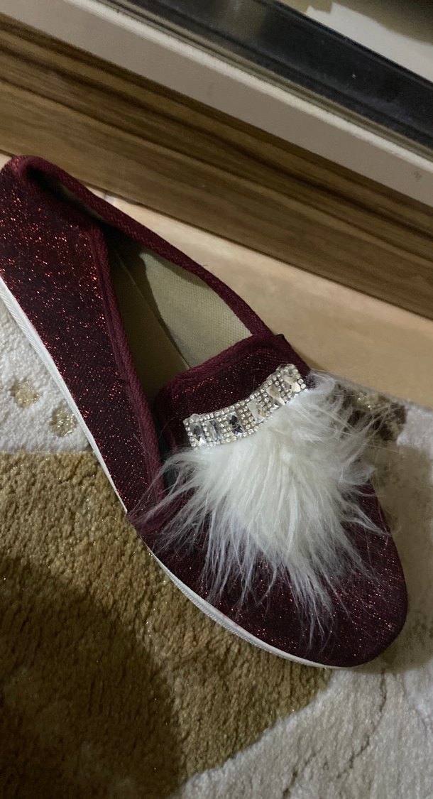 Bordo parlak sentetik kumaştan, dolgu topuklu kadın ayakkabısı. Tüylü ve taş detaylı, gösterişli tasarıma sahip.