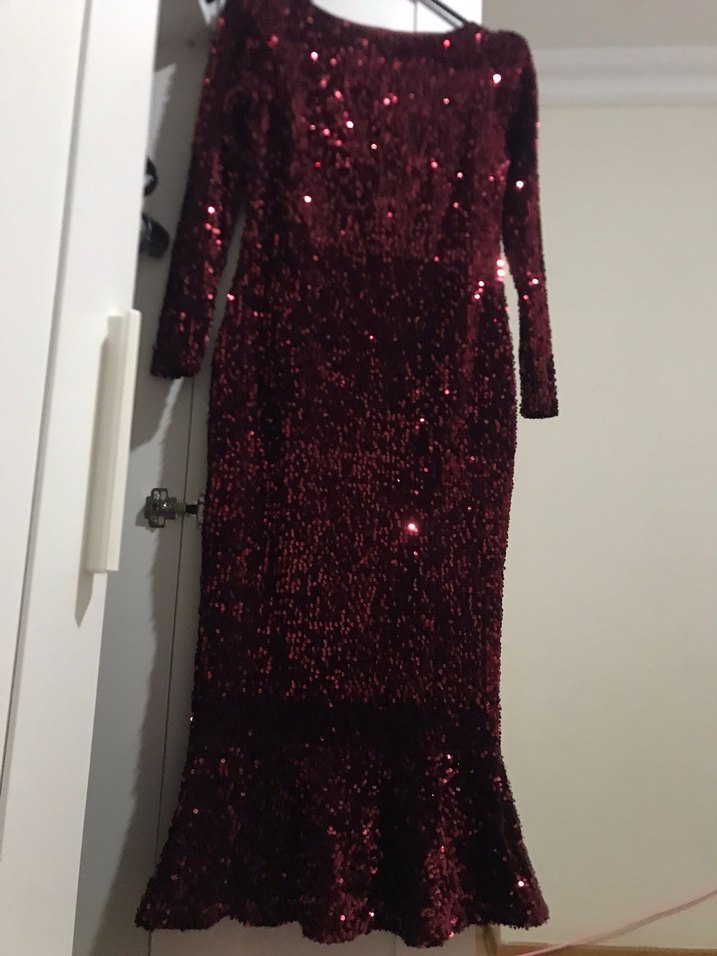 Bordo renkli, uzun kollu ve dar kesim abiye elbise. Parlak simlerle süslenmiş, romantik akşamlar için uygun, gotik ve göz alıcı tarzda. ✨