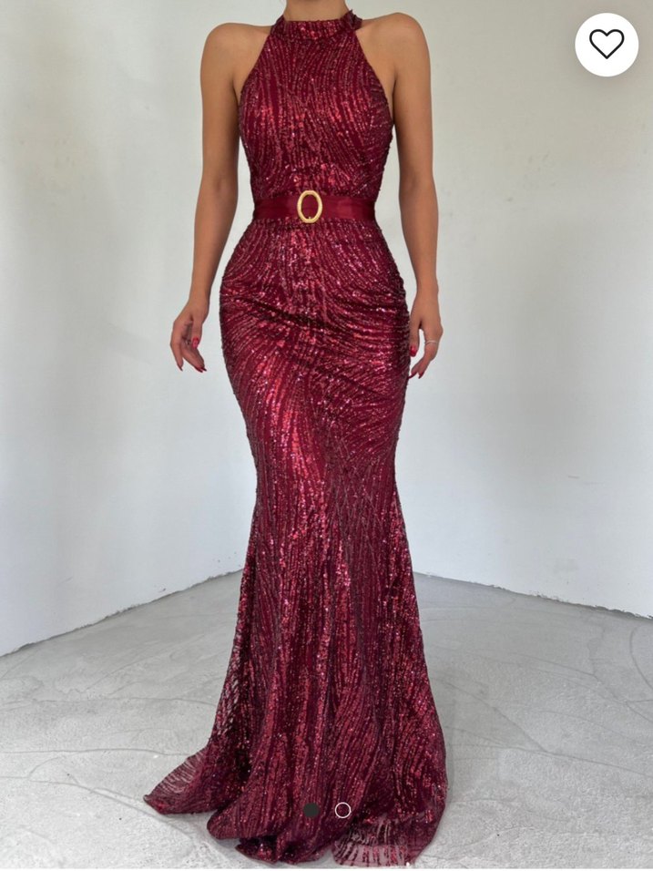 Bordo parlak uzun abiye elbise, kemerli ve askılı tekne yaka detaylarıyla cesur parti stilleri için ideal. ✨