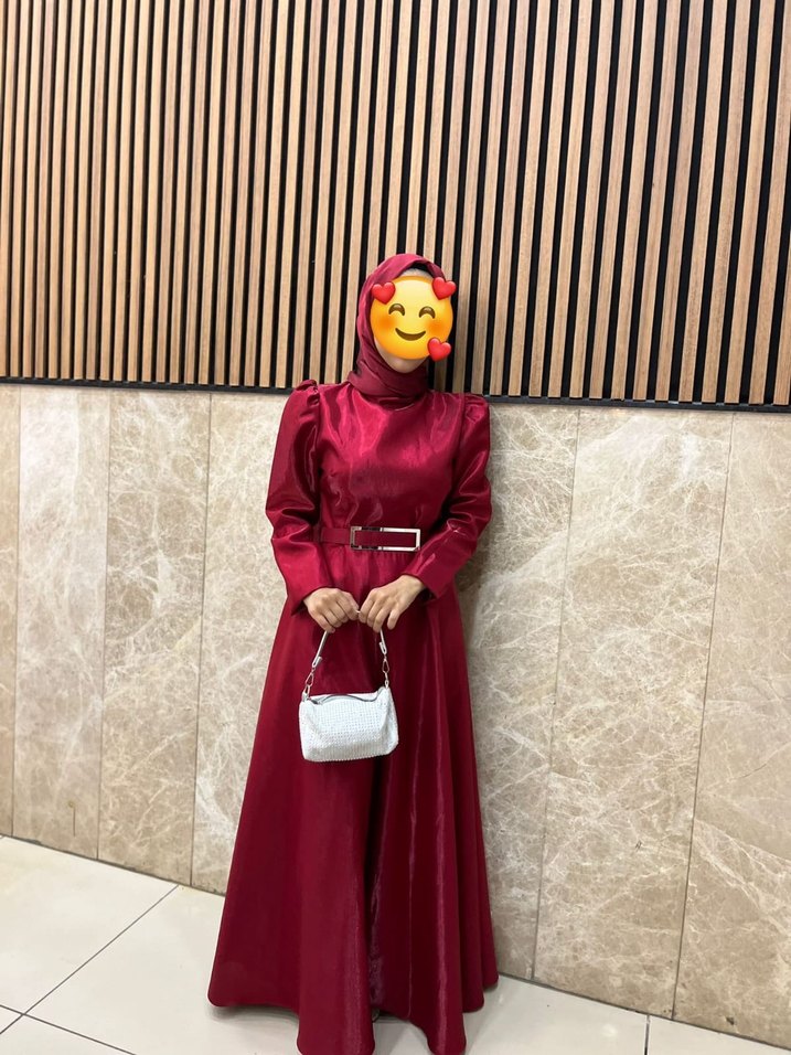 Bordo renkli, parlak kumaştan uzun elbise. Yüksek yaka ve kemerli, ince askılı kollara sahip, modest ve rahat kesim.