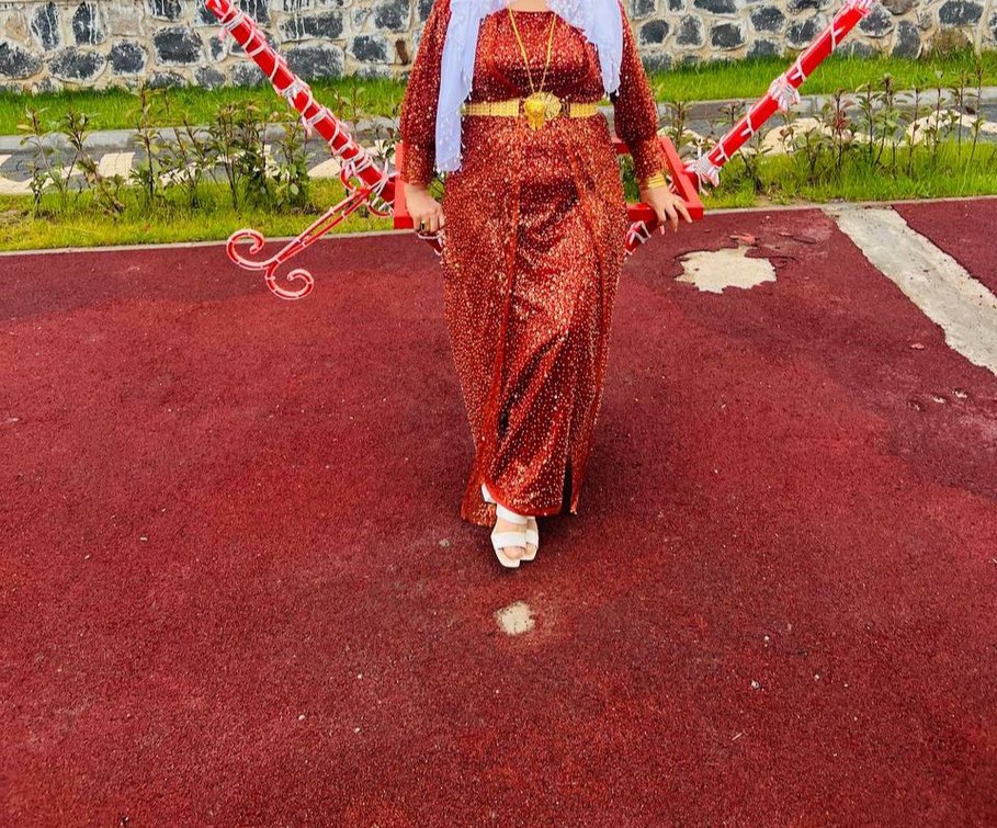 Bordo renkli, uzun kollu, V yakalı ve parlak desenli simli kumaştan yapılmış, modest ve gösterişli bir düğün elbisesi.
