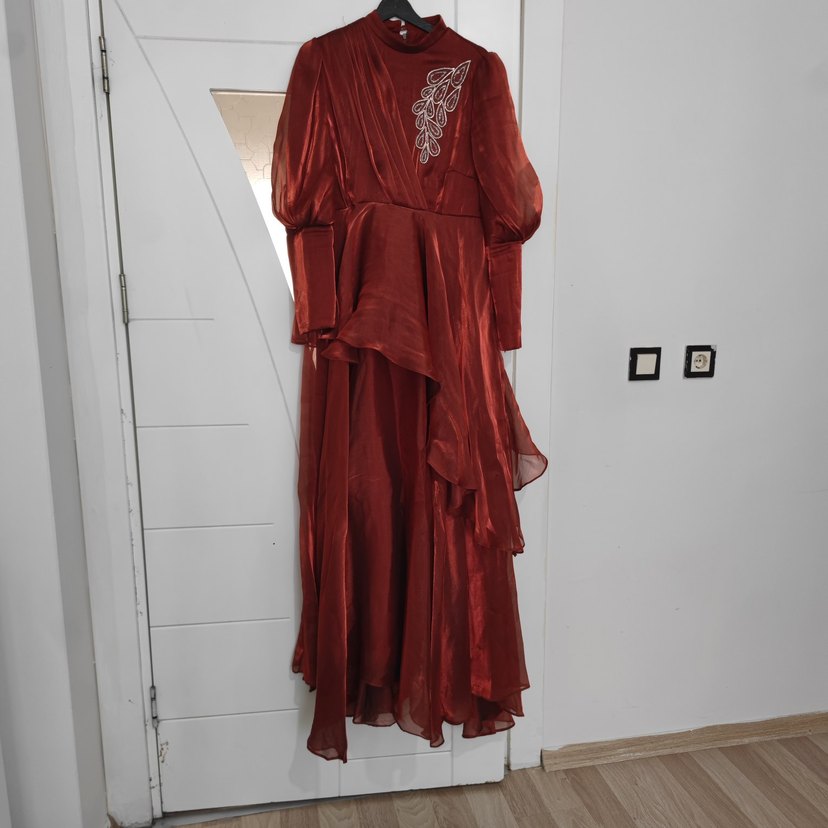 matex marka Abiye elbise 1 defa 3 saat tek giyilmiştir 2.500 aldım indirim payı vardır abiyenin kemeri var bide 2 tane aynı renkte metrelik şal almıştım onlarıda vericem kiremit parlak kumaştan, uzun kollu kol kısmında zincir vardır ve yüksek yakalı, drapeli, bol kesim vintage goth tarzı abiye elbisedir. Düğünler için uygundur.