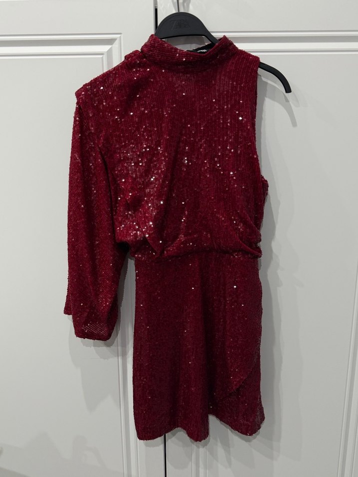 Bordo, uzun kollu, yüksek yakalı ve parıltılı detaylara sahip, vücuda oturan mini elbise. Şık akşamlar için uygun. ✨