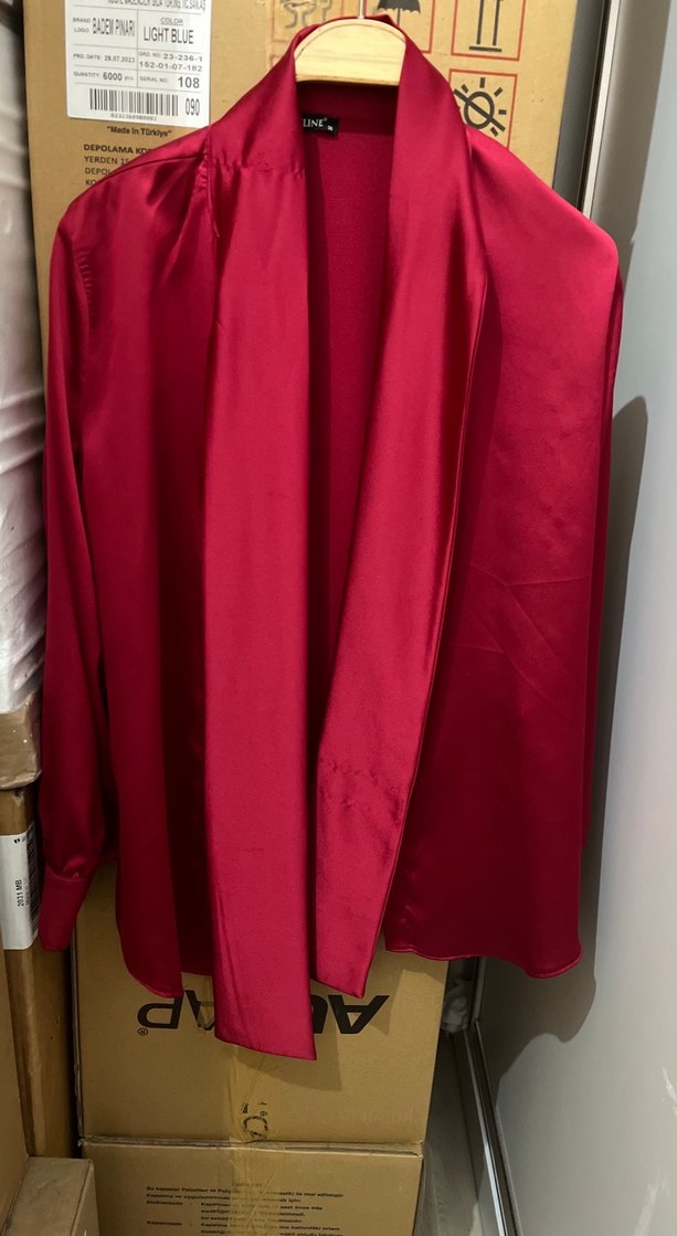 Bordo renkli, parlak kumaştan yapılmış uzun kollu ve midi boyda, düzenli kesime sahip Paris tarzı modern kadın sabahlığıdır. ✨