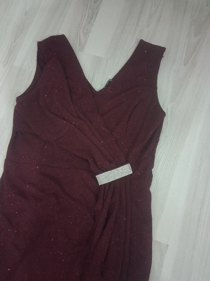 Bordo renkli, kolsuz, eV yaka ve oturan kesime sahip, parlak dokunuşlu, toka detayı bulunur. Parti için uygun. ✨2 KOL ARASI 46 CM UZUNLUK 104 CM