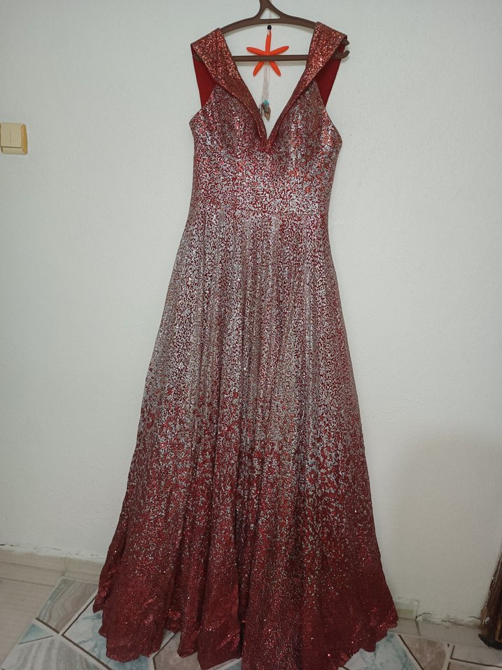 Kolsuz, bordo renkli bu uzun abiye elbise, drapeli V yaka ve parlak batik deseniyle düğünler için uygundur.