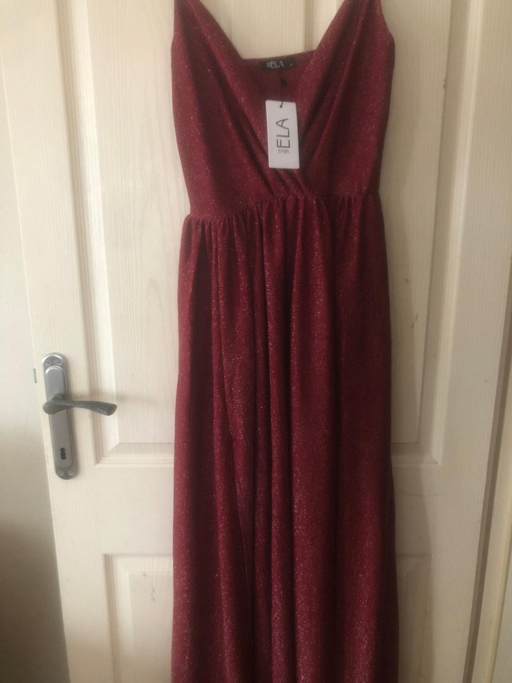 Bordo parlak kumaştan, drapeli ve askılı, V yaka uzun abiye elbise. Şık ve klasik bir görünüm için uygundur.✨