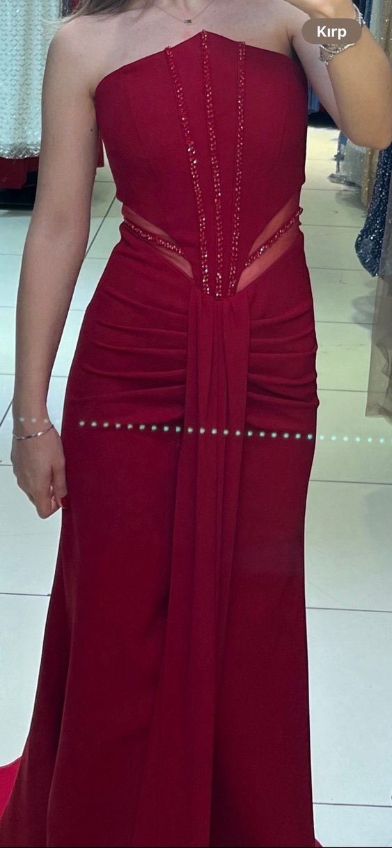 Parlak kumaştan, drapeli ve V yakalı bordo uzun abiye elbise. İnce askılı ve modern kesim, düğünler için uygun.