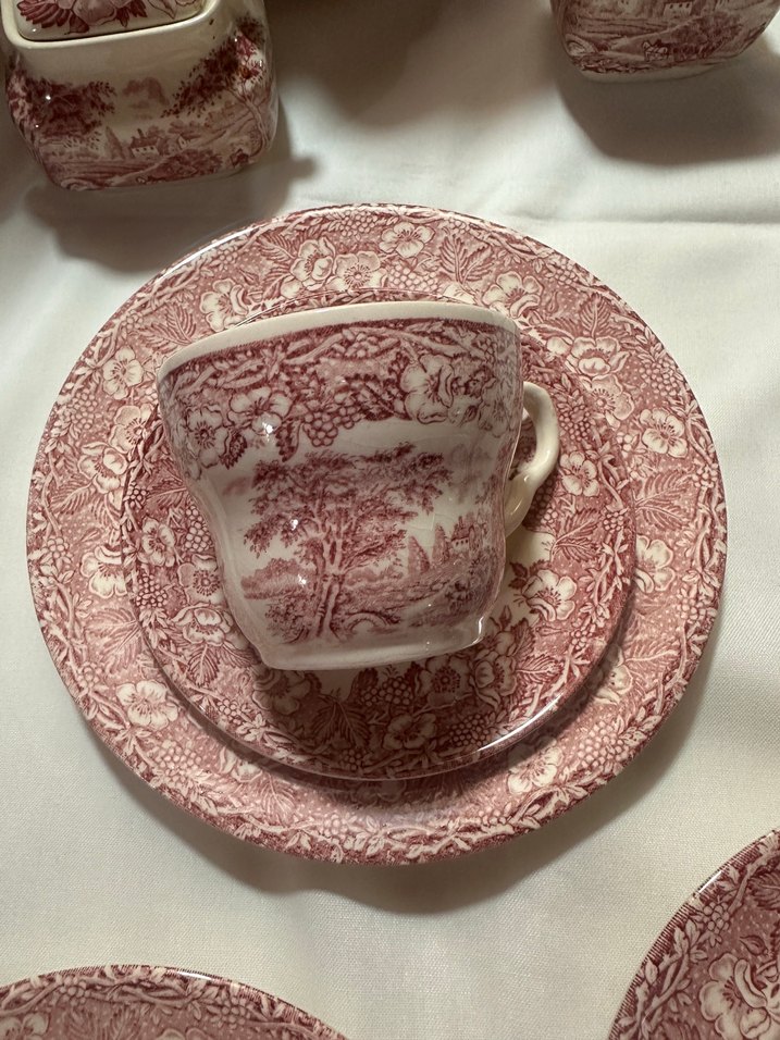 Bordo pastel desenli porselen fincan ve tabak seti, çiçek ve manzara detaylarıyla klasik bir şıklık sunar.
